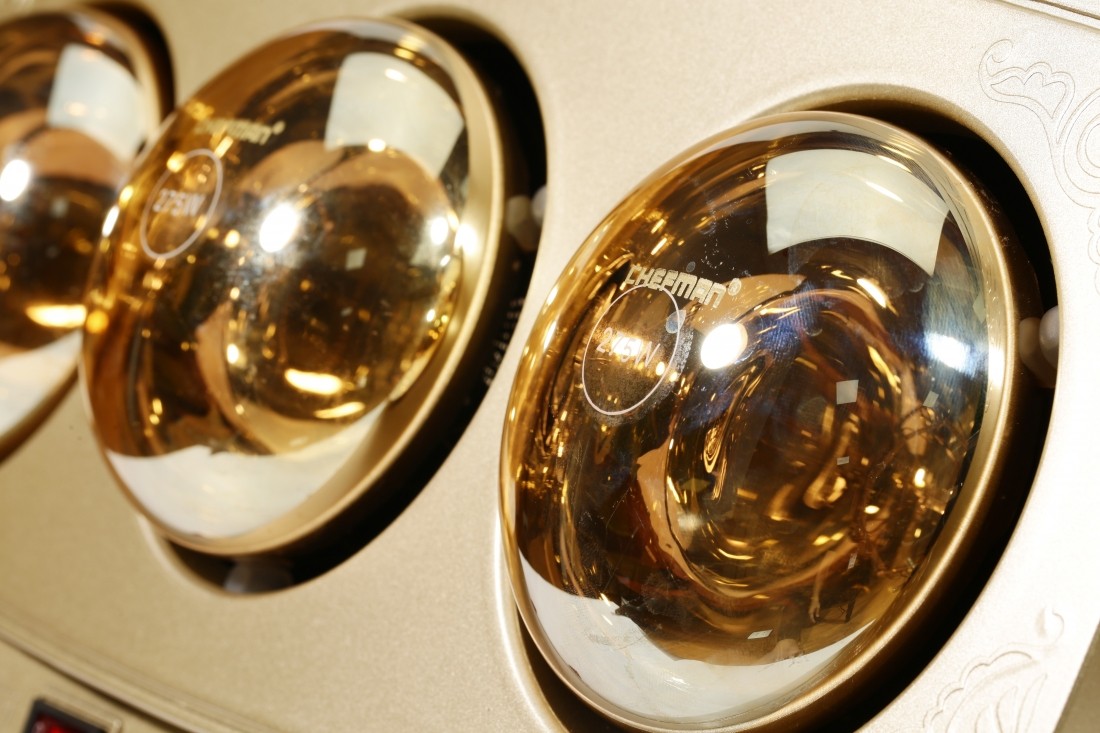 Đèn sưởi ấm sử dụng bóng hồng ngoại với khả năng chống cháy nổ và độ an toàn cao trong khi sử dụng. Cùng với nguyên lý bức xạ hồng ngoại, giúp đạt được nhiệt độ 30ºC trong 2 - 3 giây. Bóng đèn sưởi được bao phủ lớp mạ vàng giúp giảm độ chói sáng nhưng không làm giảm hiệu quả làm ấm. Công suất 275W/bóng. Công suất tối đa khi bật cả 3 bóng là: 875W. Tuổi thọ lên đến 10.000 giờ.